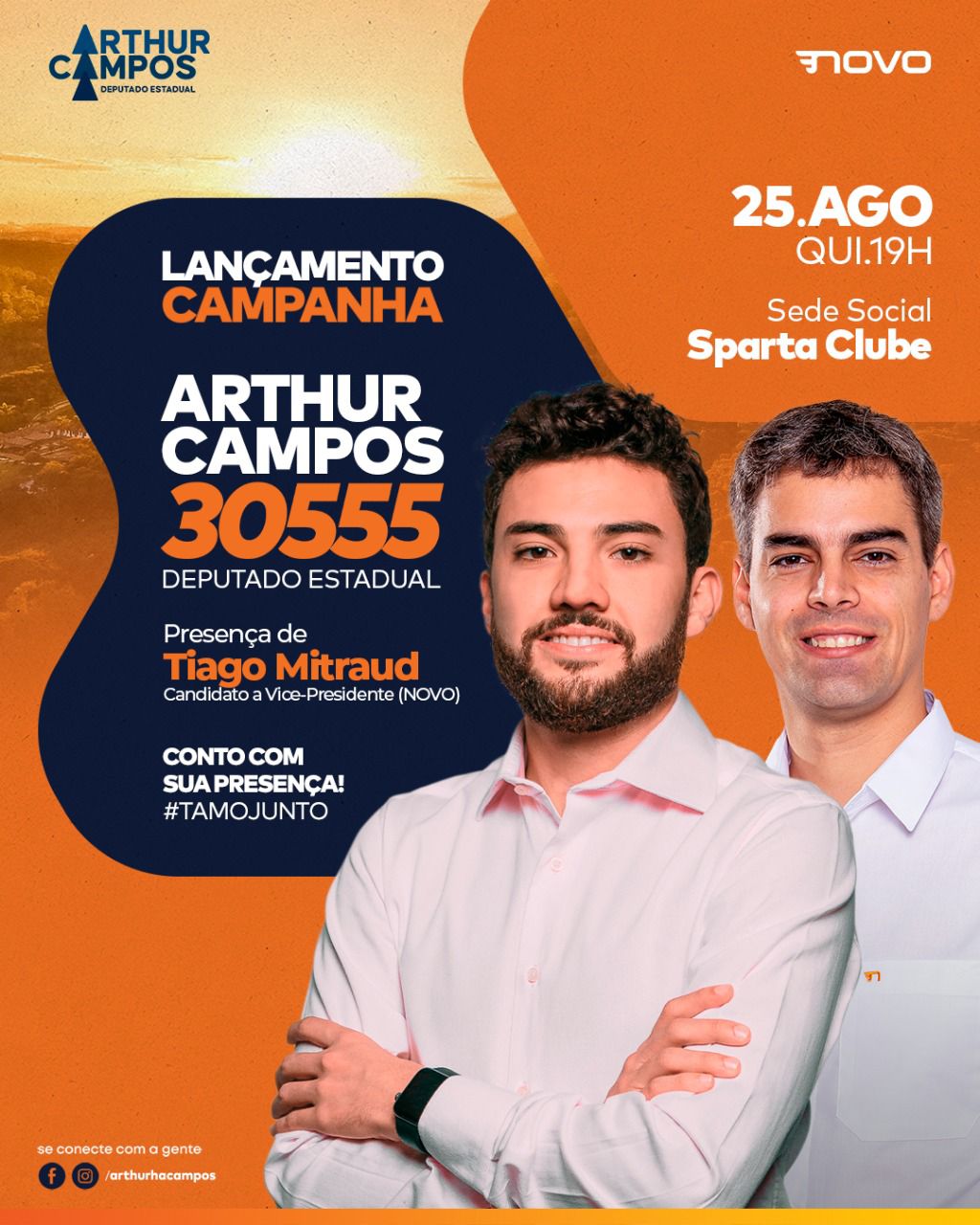 O ex-Secretario de Governo de Ouro Branco e filho do atual prefeito Hélio Campos Artur Campos (Novo), realiza nesta quinta-feira 25, reunião em Ouro Branco, para lançamento oficial da sua campanha a Deputado Estadual. O encontro acontece no espaço Sparta Clube(Antiga sede da AEA), localizado no bairro Pioneiros, às 19 horas.