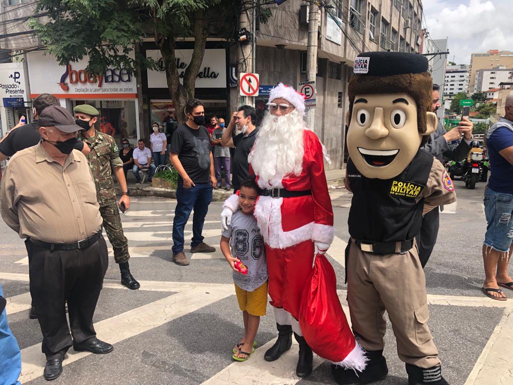 Foram entregues Dicas PM Serviço de Natal, balas, pipocas e pirulitos para as crianças.