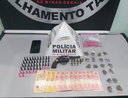 Militar encontrou 01 revólver calibre .32, 12 cartuchos do mesmo calibre, 48 microtubos de cocaína, 18 buchas de maconha, a quantia de R$ 190,00 (cento e noventa reais) e microtubos vazios para o armazenamento de drogas.