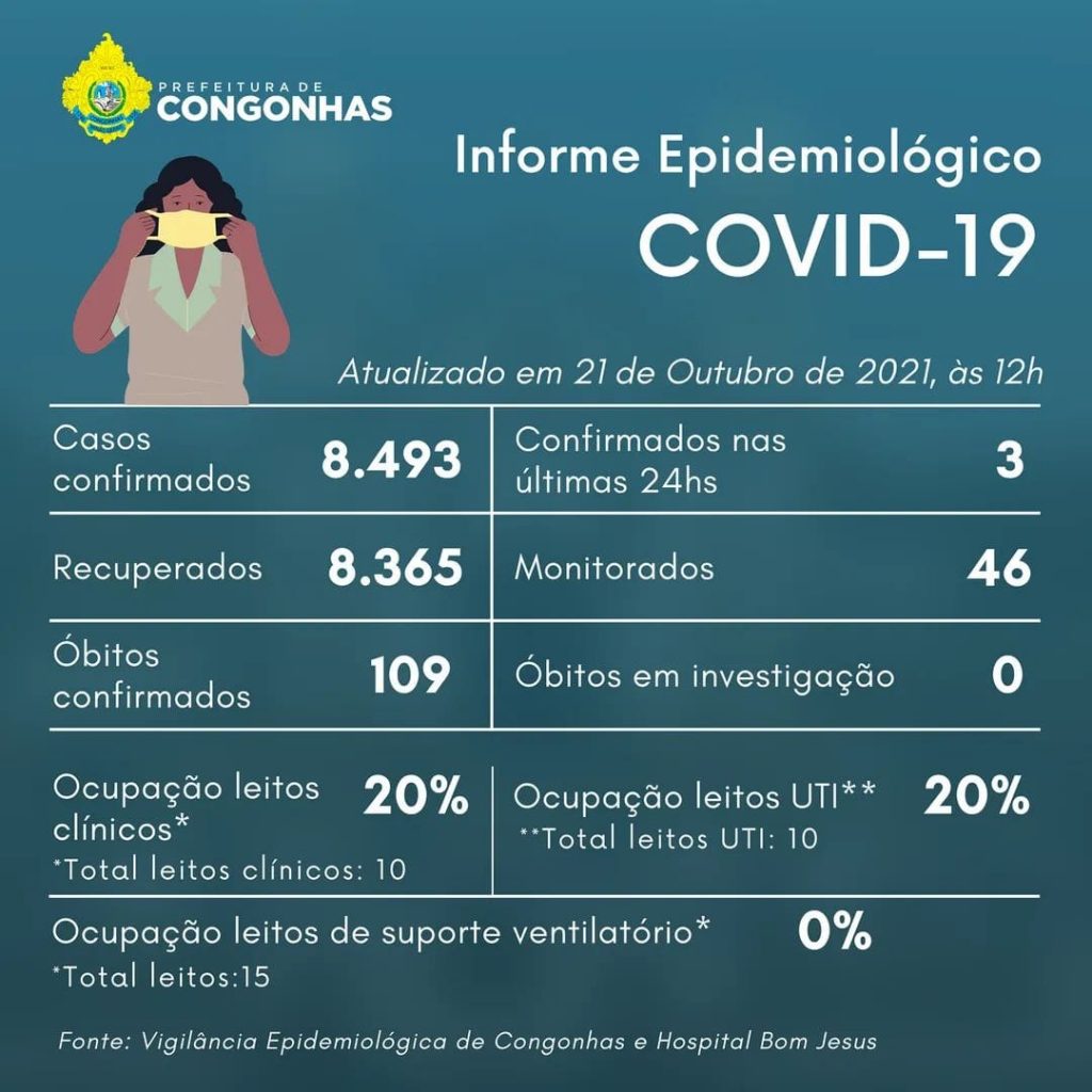 A Secretaria Municipal de Saúde informa que, até às 12h desta quinta-feira, 21 de Outubro de 2021, 8.493 casos de Covid-19 haviam sido confirmados em Congonhas. Deste total, 8.365 pacientes já receberam alta. Foram confirmados 3 novos casos nas últimas 24 horas e estão sendo monitorados 46 casos da doença.