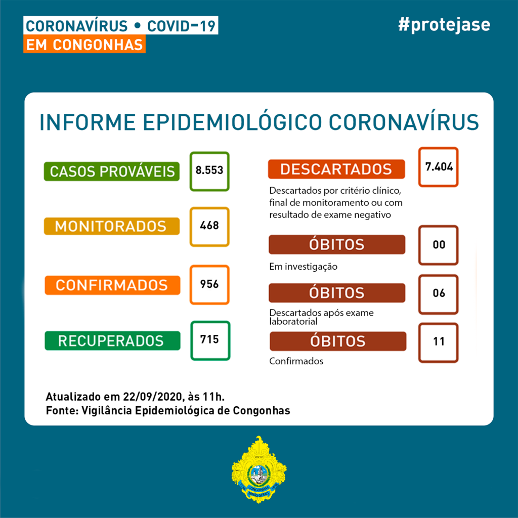 A Secretaria Municipal de Saúde informa que até as 11h desta terça-feira, 22 de setembro, 956 casos de Covid-19 haviam sido confirmados em Congonhas. Já receberam alta hospitalar e/ou cumpriram isolamento domiciliar de 14 dias sem intercorrências 715 casos confirmados de Covid-19.