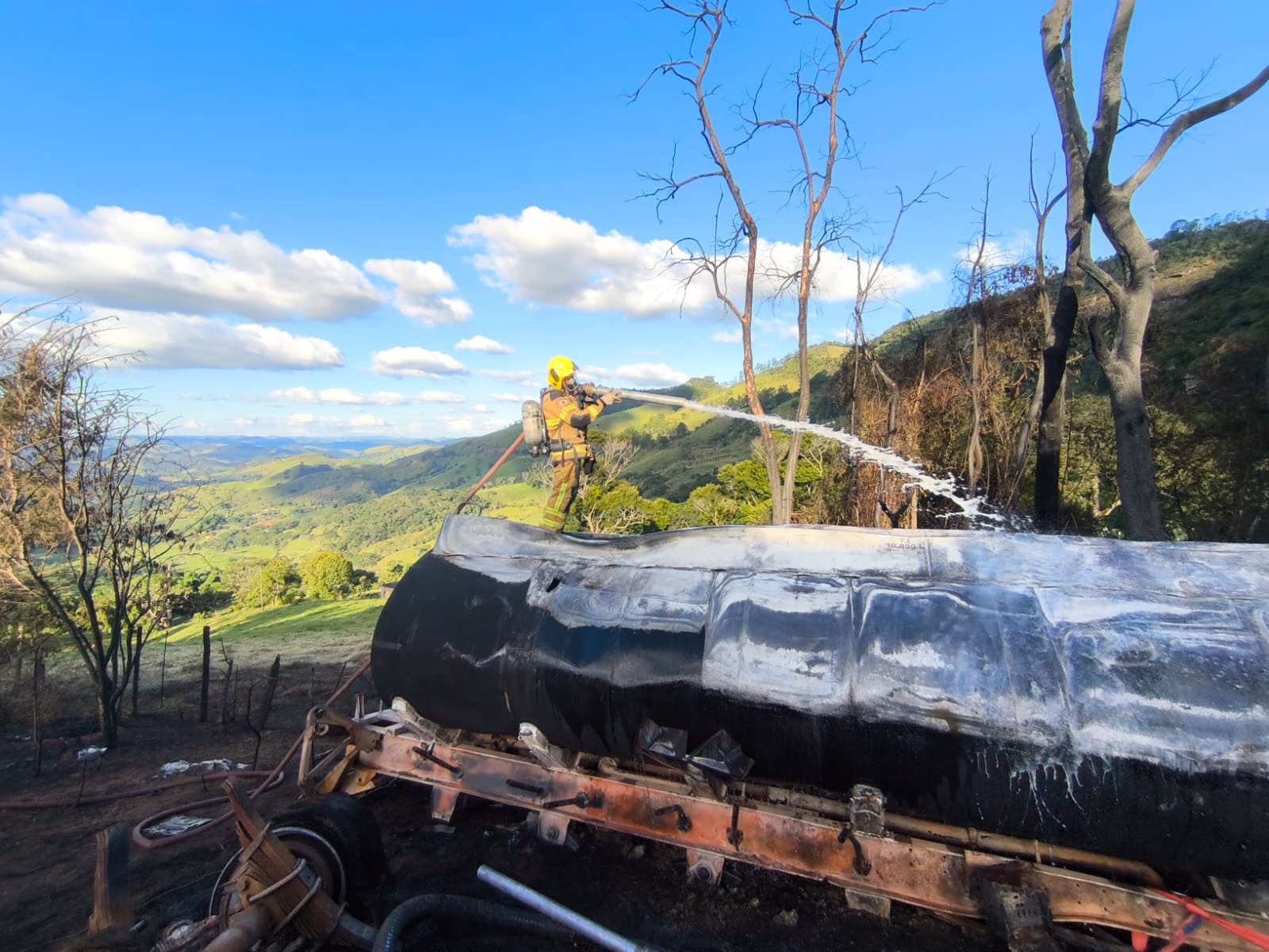 CORPO DE BOMBEIROS MILITAR DE MINAS GERAIS SEGUE ATUANDO EM OCORRÊNCIA COM CAMINHÃO-TANQUE NA SERRA DE SANTA BÁRBARA DO TUGÚRIO