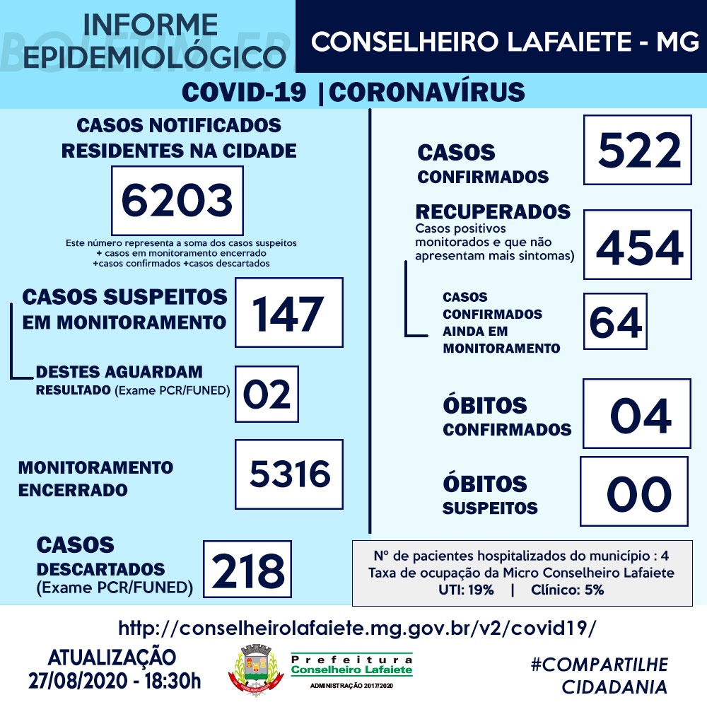 A Prefeitura de Conselheiro Lafaiete por meio da Secretaria Municipal de Saúde e do Serviço de Epidemiologia cumpre o compromisso de manter a população sempre informada sobre as ocorrências ligadas ao combate a COVID-19 no município de Conselheiro Lafaiete.