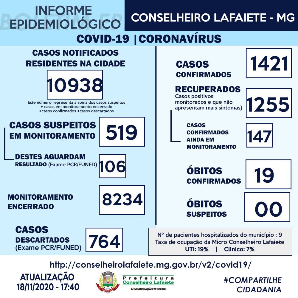 A ocupação dos leitos em Lafaiete nesta quarta-feira, 18/11, está em 19% em leitos de UTI e 7% em clínicos.