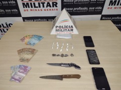 papelotes de cocaína e 05 buchas de maconha, 03 aparelhos celulares, a quantia de R$ 250,00 (duzentos e cinquenta reais) em cédulas falsas e a quantia de R$ 423,00 (quatrocentos e vinte e três reais) em cédulas verdadeiras, dentre outros materiais relacionados ao crime em questão.