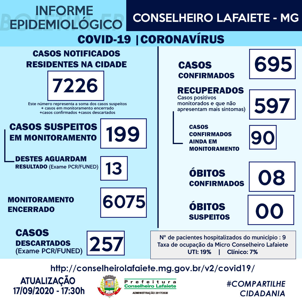 A Prefeitura de Conselheiro Lafaiete através da Secretaria Municipal de Saúde e do Serviço de Epidemiologia com o compromisso de manter a população sempre a par das ocorrências ligadas ao combate ao COVID 19 confirmou dez novos casos de Coronavírus em Conselheiro Lafaiete.