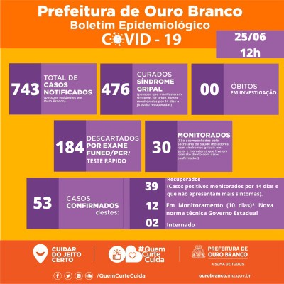 A Prefeitura de Ouro Branco informa que nessa sexta-feira, dia 26/06, foram confirmados 10 novos casos de Covid-19 de pessoas residentes em Ouro Branco.