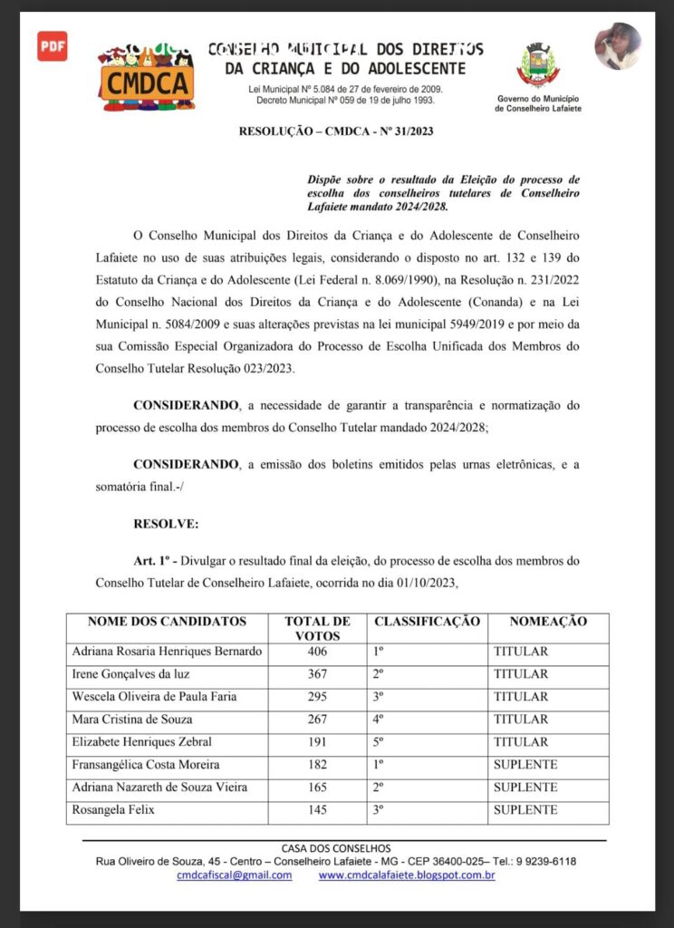 Neste domingo, dia 1º, foi realizada em Conselheiro Lafaiete, a eleição dos novos membros do Conselho Tutelar de Conselheiro Lafaiete, com mandado para os próximos quatro anos.