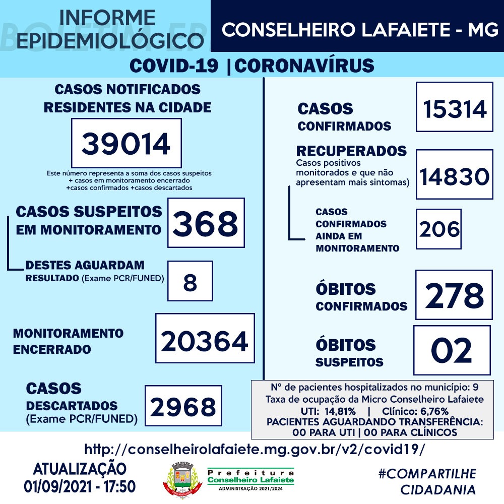 A ocupação dos leitos em Lafaiete nesta quarta 01/09, está em 14,81% em leitos de UTI e 6,76% em clínicos.