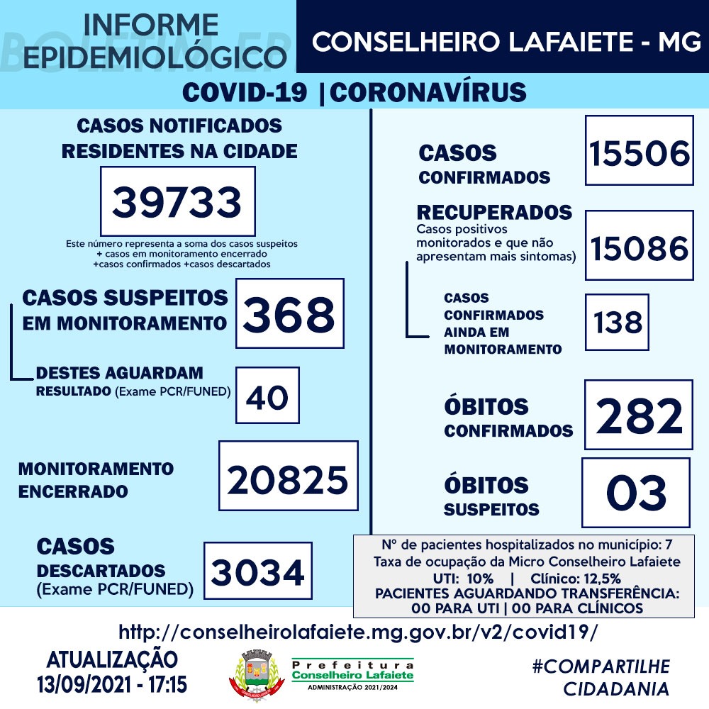A Prefeitura de Conselheiro Lafaiete através da Secretaria Municipal de Saúde e do Serviço de Epidemiologia com o compromisso de manter a população sempre a par das ocorrências ligadas ao combate ao COVID 19 informa que confirmou 9 (nove) novos casos de Coronavírus em Conselheiro Lafaiete.