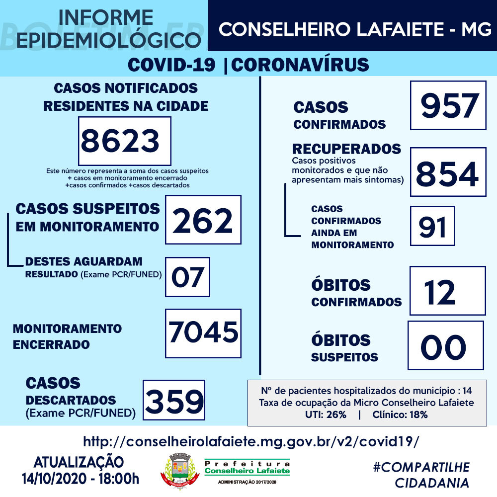 A ocupação dos leitos em Lafaiete nesta quarta-feira, 14/10, está em 26% em leitos de UTI e 18% em clínicos.