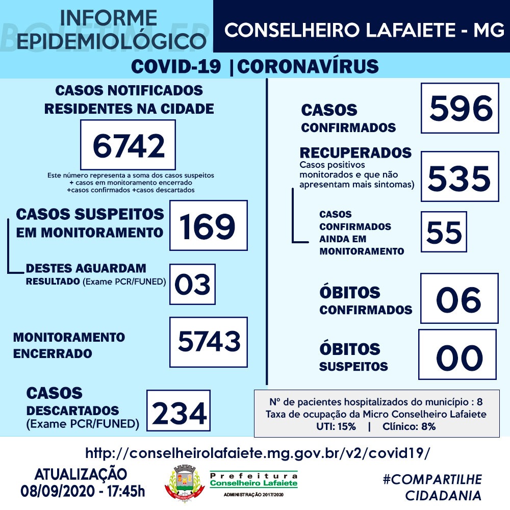 A ocupação dos leitos em Lafaiete nesta terça-feira, 08/09, está em 15% em leitos de UTI e 8% em clínicos.
