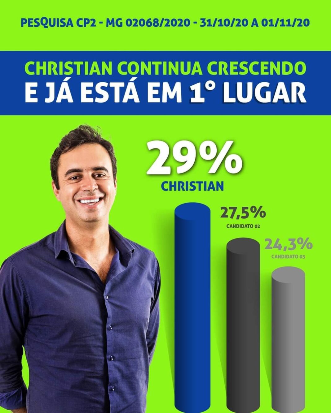 Uma pesquisa eleitoral divulgada nesta quinta-feira (5) aponta o Candidato a prefeito CHRISTIAN, que está na dianteira da disputa eleitoral nas eleições de outubro. De acordo com o Instituto CP2, pesquisa registrada no TRE. Sob numero MG 02068/2020, CHRISTIAN tem preferência de 29,% dos eleitores na pesquisa estimulada, numa outra simulação foi perguntado quem você acha venceria a eleiçao, 38.3% responderam que CHRISTIAN venceria a eleição em Congonhas.