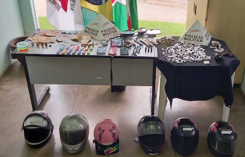 Diante do flagrante, a Polícia Militar adentrou e realizou a abordagem deles. Foram apreendidos dinheiro, materiais utilizados para dolagem de drogas, 250 invólucros de crack e mais 26 pedras dessa substância, 01 barra e mais 08 invólucros de maconha, 09 pinos de cocaína, 02 motocicletas e capacetes cujas características eram idênticas àqueles utilizados em um crime de roubo registrado no dia 18 de janeiro do corrente ano, além de retrovisores de motocicletas.