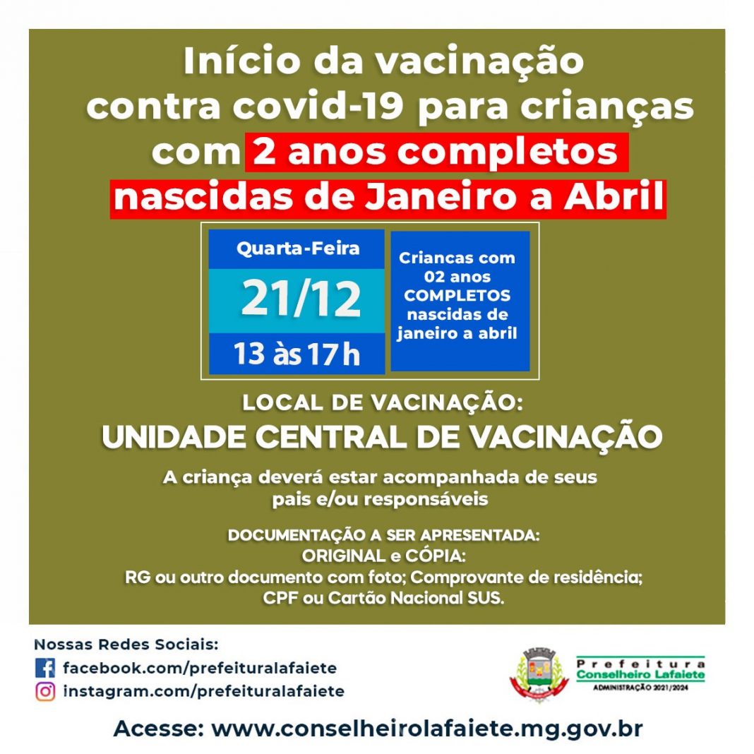 A Secretaria de Saúde de Conselheiro Lafaiete iniciará no dia 21 de dezembro, a vacinação contra a Covid-19 de crianças com 2 anos completos nascidas entre os meses de Janeiro a Abril. A imunização será realizada na Unidade Central de Vacinação no horário de 13:00 às 17:00 horas. Destacamos que este horário o atendimento na Unidade Central de Vacinação será EXCLUSIVO para aplicação da vacina Pfizer Baby. (Neste dia a à vacinação de rotina das demais vacinas podem ser administradas nas Unidades de Estratégia de Saúde da Família dos bairros).